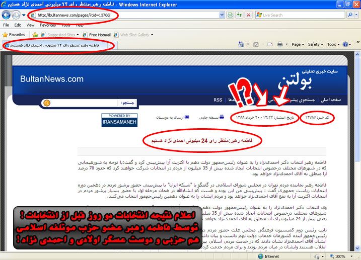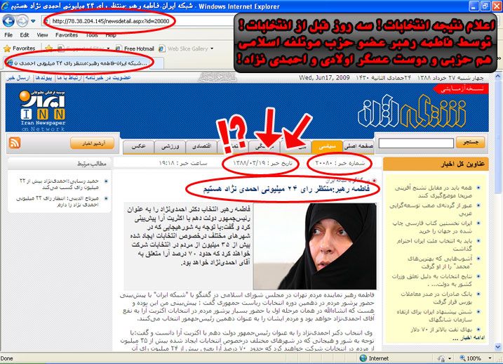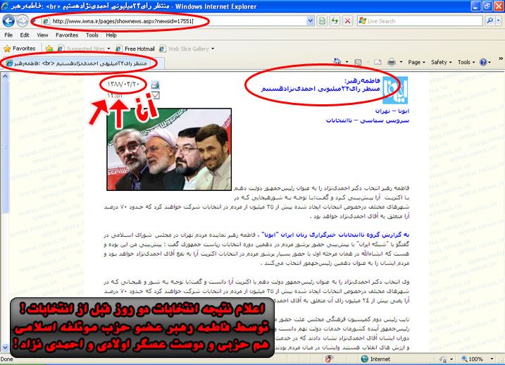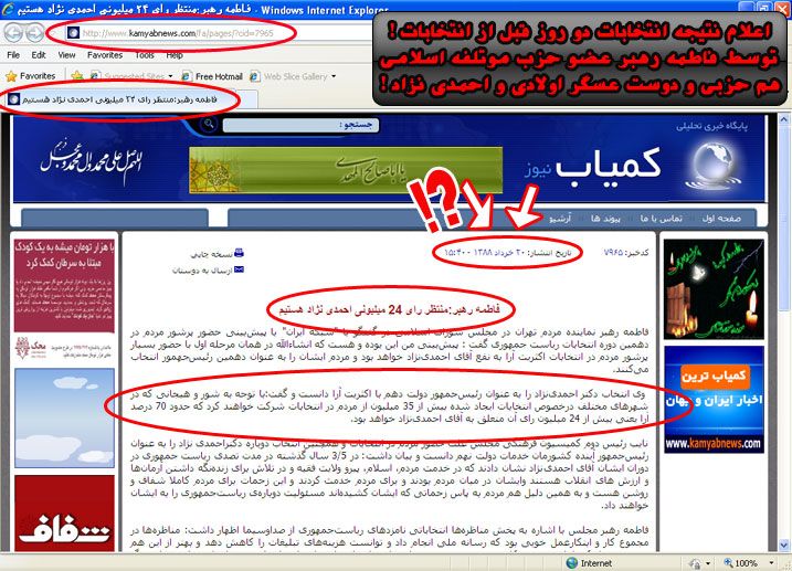 اعلام نتايج انتخابات به صورت بسيار دقيق و شگفت انگيز ، سه روز پيش از انتخابات ! توسط فاطمه رهبر ، هض. فراکسيون اکثريت مجلس و عضو حزب موتلفه اسلامي ، دوست و هم حزبي حبيب الله عسگر اولادي و از حاميان اصلي احمدي نژاد در خبرگزاري هاي دولتي . پيش از حذف شدن اين خبر از خبرگزاري هاي مزبور ، به لينک هاي داده شده مراجعه و حتي الامکان از شماره خبر استفاده کنيد .