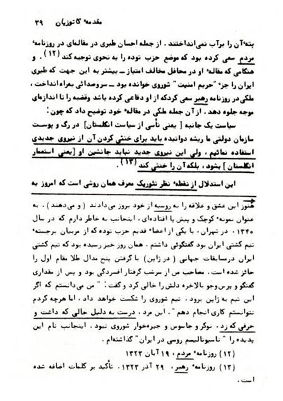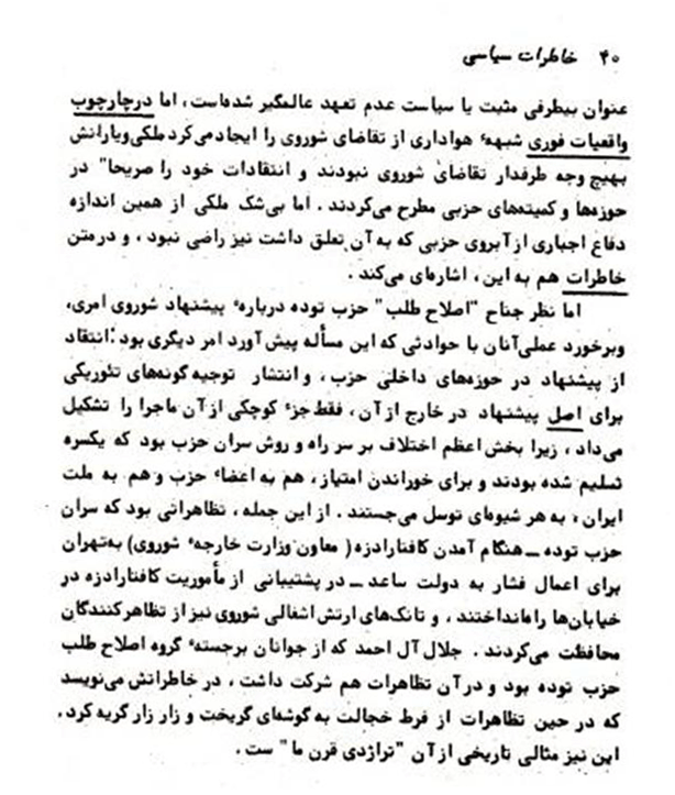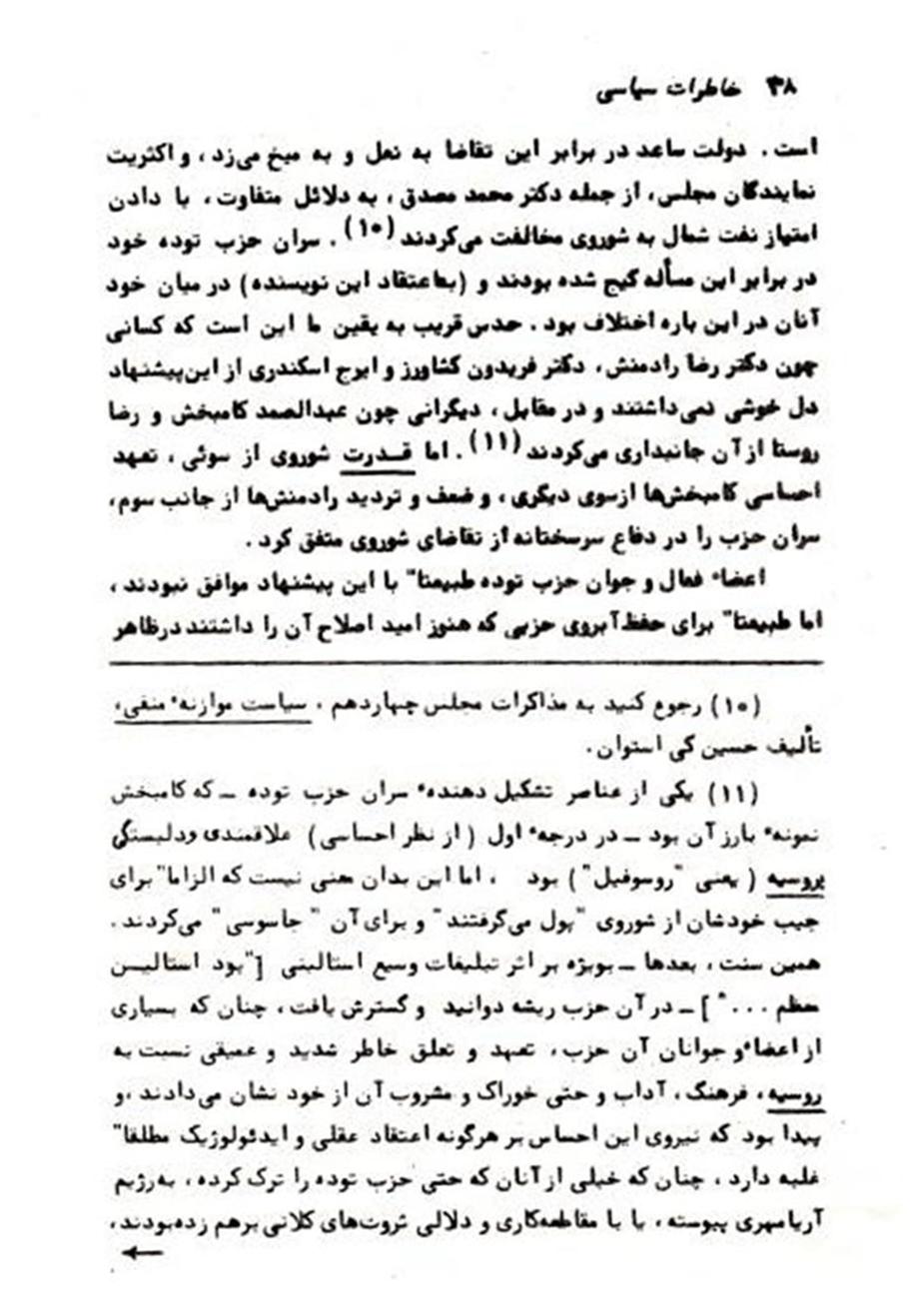 ــــــــــــــــــــــــــــ همانطور که قبلا اشاره رفت، این بخش از صفحات خاطرات سیاسی خلیل ملکی به قلم دکتر محمد علی کاتوزیان بعنوان پانویس شماره ١۵ مقاله: «تحریف تاریخ ـ بخش پنجم؛ نظرات متناقض و انحرافی خليل ملکی درباره دکترمصدق!» مورد استفاده قرار گرفته بود.