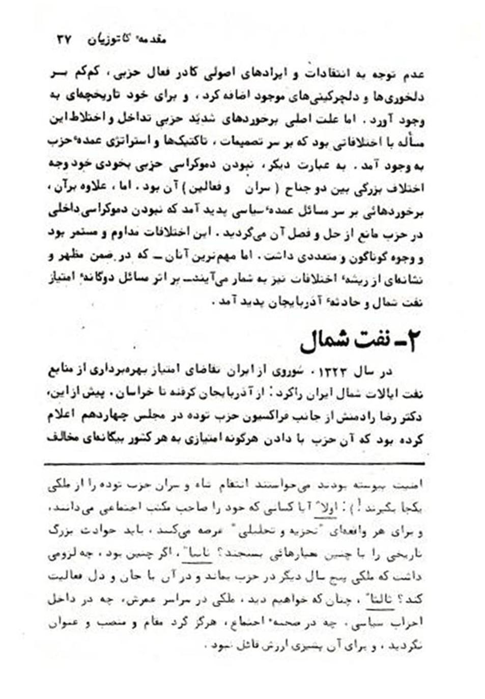 دکتر منصوربیات زاده دکتر محمدعلی همایون کاتوزیان نویسنده کتاب «خاطرات سیاسی خلیل ملکی»، در مقدمۀ آن کتاب به مقاله ای که خلیل ملکی در ٢٩ آذر ١٣٢٣ در روزنامۀ «رهبر» در رابطه با مقالۀ احسان طبری که او در ١٩ آبان ١٣٢٣ در روزنامۀ «مردم برای روشنفکران» نوشته بود و«ایران را جزء حریم امنیت شوروی خوانده بود» اشاره نموده است. ولی آن جناب ازتیتر مقالۀ مزبور که گویا خلیل ملکی در دفاع از احسان طبری در روزنامۀ «رهبر» نوشته بود،نامی نبرده است. ودر رابطه با محتوی مقالۀ مزبور می نویسد: «ملکی در روزنامه رهبر سعی کرد که از او دفاعی کرده باشد و قضیه را تا اندازه ای موجه جلوه دهد....». و در آن رابطه متذکر می شود که: « ملکی و یارانش بهیچ وجه طرفدار تقاضای شوروی نبودند»!! اظهاراتی که کاملا ً اشتباه می باشد. درحالیکه، اسناد و مدارک درباره موضوع خواست «امتیاز» نفت شمال از سوی کافتارادزه، معاون وزارت امورخارجه دولت بلشویکی حاکم بر روسیه بیانگر عکس اظهارات «استاد» محترم دانشگاه آکسفورد انگلیس،می باشد.حتی، به استناد به مقالات خود خلیل ملکی. خلیل ملکی در اواخرآذرماه ١٣٢٣ تحت عنوان "سروته يک کرباس" ، مقاله ای در سه بخش در روزنامه «رهبر» ارگان مرکزی حزب توده ايران، به سال دوم، شماره های ۴٣٨ ـ ۴٣٧ ـ ۴٣۶ ، نوشته است.او در آن مقالۀ از دولت کمونیستی حاکم بر روسیه حمایت و پشتیبانی می کند و با نظرات و عملکرد دکتر مصدق در مجلس شورای ملی، آنهم در این رابطه که ایشان با اعطای امتياز نفت شمال به دولت شوروی مخالف بوده و طی پیشنهادی به تاریخ ١١ آذرماه ١٣٢٣ در رابطه با تحریم امتیاز نفت به کشورهای بیگانه مطرح می کند، که با تصویب آن پیشنهاد از سوی مجلس به قانون ۴ ماده ای «تحریم امتیازنفت» تبدیل می شود.موضوعی که باعث رنجش خاطر دولت شوروی و طرفداران آن دولت در ایران، از جمله خلیل ملکی می شود. آن «قانون»، سبب تحریر مقالات "سروته يک کرباس" و «توازن منفی»... از سوی خلیل ملکی می شود! ونه موضوع « دفاع ازاحسان طبری». در زیر به لینک مقاله «سروته یک کرباس» و نقدی که دکتر خسروشاکری تحت عنوان «خلیل ملکی و مصدق» درباره آن مقالۀ تحرير کرده بود، اشاره رفته است. علاوه بر آن مقالۀ، خلیل ملکی در مقالا دیگری ، ازجمله «توازن منفی» در رابطه با موضوع «امتیاز» نفت شمال بصورت مثبت اظهار نظر نموده و مجددأ با نظرات دکترمصدق به جدل و پلمیک پرداخته است. در واقع دکتر محمدعلی همایون کاتوزیان، از طریق چنان شیوه تاریخنگاری، سعی کرده بر مواضع ضدملی و ارتجاعی خلیل ملکی که در مقالۀ «سروته یک کرباس» ... مطرح شده بود، سرپوش بگذارد. درحالیکه وظیفه یک تاریخنگار مسئول این است که در هنگام نگارش «خاطرات سیاسی خلیل ملکی» ،همانطور که به نظرات مربوط به «نیروی سوم» توجه نموده بود، همچنین محتوی مقالۀ «سروته یک کرباس» را نیز مورد توجه و تفسیر قرار می داد. نه اینکه همچون یک پروپاگاندیست حزبی عمل کند، یعنی بدین خاطر که محتوی آن مقالۀ چون با خود بارمنفی بهمراه داشته است، به محتوی آن توجه ننماید،.در حالیکه آن محتوی بیانگر نظرات سیاسی خلیل ملکی در یک مقطعی از دوران مبارزات او می باشد. در واقع آن «استاد» محترم از آن طریق دست به «سانسور» زده و از ذکر تیتر و محتوی آن مقالۀ در کتاب خاطرات سیاسی جلوگیری نموده است!! محتوی مقالاتی همچون «سروته یک کرباس» و «توازن منفی»... بیانگر این واقعیت تاریخی هستند که خلیل ملکی در آن مقطع تاریخی از مبلغین سیاست اتحاد جماهیر شوروی و از طرفداران «امتیاز» نفت ازسوی آن دولت در ایران بوده است. دکتر انور خامه ای در باره تصویب قانون «تحریم امتیازنفت» از سوی مجلس که برپایه پیشنهاد دکتر مصدق شکل گرفته بود در صفحه ١۴٨ جلد دوم خاطراتش در رابطه با مواضع خلیل ملکی در آنباره می نویسد: «...نتیجه دیگر طرح فوق و تصویب آن عصبانیت شدید رهبران حزب توده از دکتر مصدق بود. حملات شدید به او شروع گردید و بیشتر این حملات از جانب اصلاح طلبانی چون ملکی و قاسمی بود.ملکی در مقالاتی تحت 