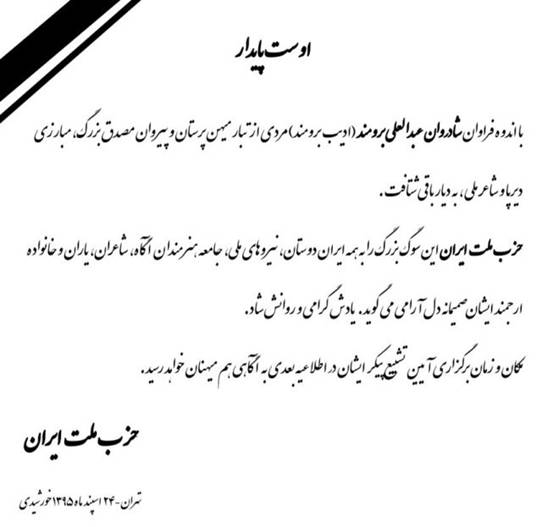 اطلاعیه حزب ملت ایران بمناسبت درگذشت شادروان عبدالعلی برومند(ادیب برومند)مردی از تبار میهن پرستان و پیروان مصدق بزرگ