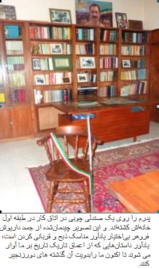 جسد فروهرها یادآور مناسک ذبح و قربانی پدرم را روی یک صندلی چوبی در اتاق کار در طبقه اول خانهاش کشتهاند. گاهی عمق واقعیت در جزئیات قابل درکتر میشود. گاهی اشیاء عریانتر موقعیت را مینمایند. آن صندلی که جایگاه مرگ داریوش فروهر بوده است، از این دست اشیاء و راوی چنین جزئیاتی ست. به گفته همرزمان پدرم که جسدش را پیدا کردند و به استناد یک عکس که چند هفته پس از قتل پدرم قاضی تحقیق اداره آگاهی به من نشان داد، صندلی او، که جسدش روی آن پیدا شد، رو به قبله چرخانده شده بود. فرش زیر پایهی صندلی، تا خورده بود. پس صندلی را هنگامی که او روی آن نشسته بود، چرخاندهاند. در آن عکس چرخش صندلی رو به قبله به شدت به چشم میآمد؛ زیرا که صندلی بر خلاف بقیهی اسباب آن مکان نه رو به مرکز اتاق که رو به دیوار داشت، به فاصلهی کمی از دیوار و در ورودی اتاق. پس چرخش غیرعادی صندلی به قصد اعمال شده و ناشی از یک تصمیم بوده است. از آنجا که پدرم در موقعیت تصمیمگیری نبوده است، پس این چرخش نمایانگر قصد و تصمیم قاتلان اوست، نمایانگر دستوری که آنها مأمور اجرایش بودهاند. در اینجا قاتلان تصویری از مرگ یک انسان ساختهاند که پیامی در بر دارد. و این تصویر چیدمانشده از جسد داریوش فروهر بیاختیار یادآور مناسک ذبح و قربانی کردن است؛ یادآور داستانهایی که از اعماق تاریک تاریخ بر ما آوار میشوند تا اکنون ما را به بدویت آن گذشتههای دور زنجیر کنند.