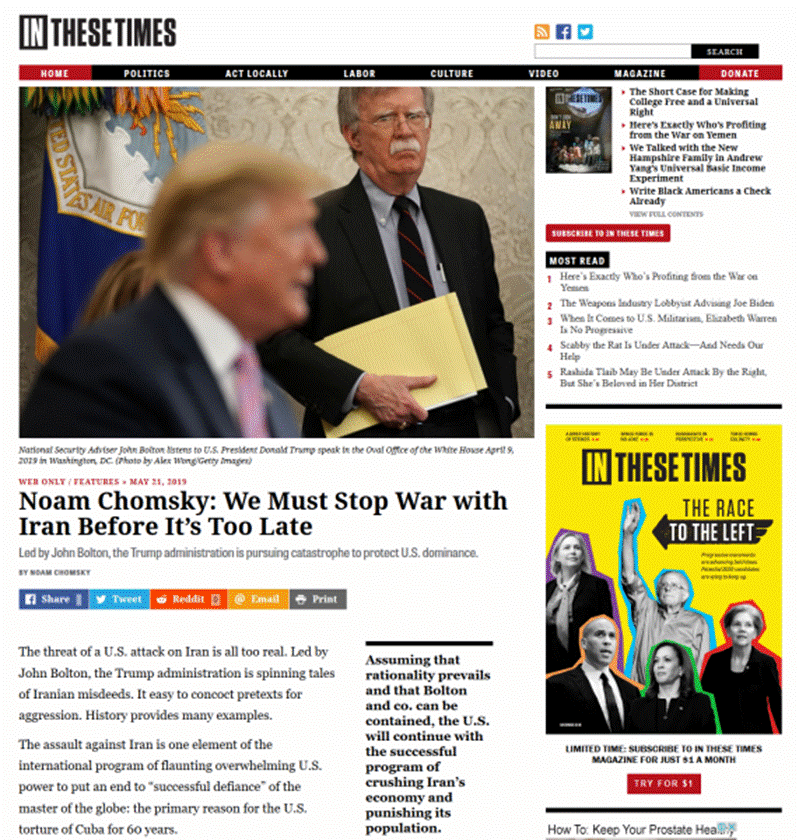 تاریخ مخابره : :١/٣/١٣٩٨ نوام چامسکی: جلوی ترامپ و جان بولتون باید گرفته شود نوآم چامسکی در وب سایت ایندیس تایم : ما باید خیلی سریع مانع حمله نظامی فاجعه بار آمریکا به ایران تحت رهبری ترامپ و جان بولتون بشویم. به گزارش جام،نوام چامسکی تحلیلگر سیاسی،زبانشناس، فیلسوف آنارشیست و نظریهپرداز آمریکایی، در مقاله ای از سیاست های تهدیدآمیز و جنگ طلبانه دونالد ترامپ و جان بولتون انتقاد کرد. این مقاله در وب سایت "ایندیس. تایم" منتشر شده است