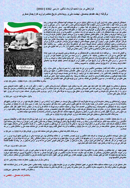 غلامرضا نجاتی مورخ تاریخ نهضت ملی ایران می نویسد: «وجود رژیم دیکتاتوری ومضار حکومت فردی بود که مانع گردید افراد مطلع و وطن دوست، در محیطی آرام، آزادانه و دور از جنجال، نظریات خود را در باره عواقب و نتایج لغو یکطرفه قرارداد دارسی و دستور امضای قرار جدید ازطرف شاه، که طبق قانون اساسی کشور، یک مقام غیر مسئول بود، ابراز کنند. از سوی دیگر، قرار داد ۱۹۳۳ در مجلسی به تصویب رسید که نمایندگان با خصوصیات رژیم دیکتاتوری انتصاب شده بودند و نماینده منتخب مردم نبودند تا هنگام طرح قرارداد در مجلس آزادانه اظهار نظر کنند. همچنین اعضای هیئت نمایندگی ایران در مذاکرات خود با نمایندگان شرکت نفت و دولت انگلستان فاقد چنان شخصیت و جرئت و شهامتی بودند که با صراحت نظریات وعقاید خود را در باره نفع و ضرر قرارداد اظهار کنند و یا با کناره گیری از شغل و مسئولیتی که بعهده داشتند، آلت فعل نشوند و دانسته و ندانسته به مملکت خود خیانت نکنند.»(۶) قرار داد سال ۱۹۳۳، گذشته از مضار مالی و اقتصادی، از لحاظ اجتماعی و سیاسی نیز نتایج بسیار زیان بخشی به بار آورد. نفوذ ویرانگرانه شرکت نفت و اینتلیجنت سرویس انگلستان روی مملکت سایه افکند. شرکت نفت مرکز و ستاد زد و بندها، توطئه گریها وعامل ترویج فساد و خیانت درهمه شئون کشور شد و عوامل آن درهمۀ ارکان مملکت نفوذ داشتند. درحقیقت شرکت نفت، دولت و قدرتی در داخل دولت ایران بود، تا جائی که مردم ایران، هر نوع تغییر و تحولی در کشور را از طرف انگلیسی ها می دانستند. بیهوده نبود که مرحوم دکتر مصدق، هنگام بحث در باره مضار قرار داد سال ۱۹۳۳ و مخالفت با قرارداد الحاقی گفت: وجود شرکت نفت در این مملکت حیات ملی و استقلال کشور را بر باد میدهد.» (۷) دکتر مصدق در دادگاه لاهه گفت: «دیپلماسی انگلیس برای این که نیات خود را به صورت دیگری عملی سازد، رژیم دیکتاتوری را که بیست سال از آن حمایت نمود، بر سر کار آورد. منظور اقتصادی سیاست انگلیس از تمهید این وسایل این بود که باانحصار نفت کشور ما را تصاحب نماید. به این ترتیب، آن چه که می بایست موجب ثروت ملی ما بشود، منشاء بلیات گوناگون و مصائب طاقت فرسای ما گردید. این سلطه به وسیله یک کمپانی صاحب امتیاز عملی می گردید. یعنی علاوه بر این که نفت ما را به سوی انگلستان می کشاند، به ضرر ایران فواید کثیرمالی عاید انگلستان می ساخت.» (۸) الول ساتن، نویسنده انگلیسی می نویسد: « شرکت نفت انگلیس و ایران تجسم و خلاصه ای از دخالت بیگانگان بود. این مؤسسه یکی از بزرگترین منابع ثروت ایران را در اختیار داشت و از آن بهره برداری می کرد و در ازای میلیونها که از کشور می برد، مبلغ ناچیزی به دولت می داد و با چنان استقلالی رفتار می کرد که دولت ایران از هیچ رئیس ایل و قبیله ای هر قدر هم مقتدر بود تحمل نمی نمود. درطرز رفتار با ایرانیان از عالی و دانی چنان نخوتی نشان می داد که برای نژادی که بیش از هر وقت به عظمت گذشتۀ خود فخر می کرد و به آیندۀ درخشان خود اعتماد داشت قابل تحمل نبود. (۹) بهمین جهت در ایام دیکتاتوری رضاخان حتی به انگلیسیها اجازه داده شده بود در تعیین مقامات کشور و افرادی که باید به مجلس شورای ملی راه یابند دخالت مستقیم نمایند. برای نمونه، تلگرافچی مخصوص رضاخان در خاطرات خود معترف است که سفارت انگلیس در تهران فهرست کسانی را که باید از صندوقها بیرون میآمدند تأیید میکرد: «هرچه خواستم بفهمم که علت این تغییر چیست، بالاخره چیزی نفهمیدم. فقط در بین گفتگو این طور اظهار داشت که گویا مقامات خارجی با انتخاب شدن من مخالف هستند و البته مقصودش انگلیسها بود» (۱۰) دکتر مصدق نیز در مورد دخالت مستقیم سلطه خارجی در تعیین نمایندگان مجلس در دوران حکومت پهلوی اول میگوید: «کدام مجلس، همان مجلس که در زمان تسلط شاه فقید هیچ وکیلی به مجلس نرفت مگر با تصویب سفارت انگلیس. بازهمان مجلس که رئیس آن را یک اکثریت متکی به سیاست بیگانه انتخاب نمود».(۱۱ ) نمایندگان فرمایشی مجلس بله قربان گوی قرارداد ننگین ۱۹۳۳ دارسی که هیچک