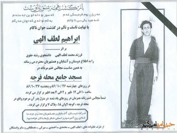 ابراهیم لطف اللهی، دانشجوی سنندجی، زیر شکنجه بازجویان اطلاعات کشته شد پنجشنبه ۲۷م دی ۱۳۸۶ به نقل از سايت خبرنامه امير کبير