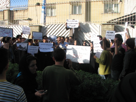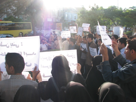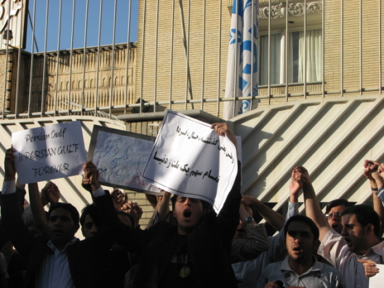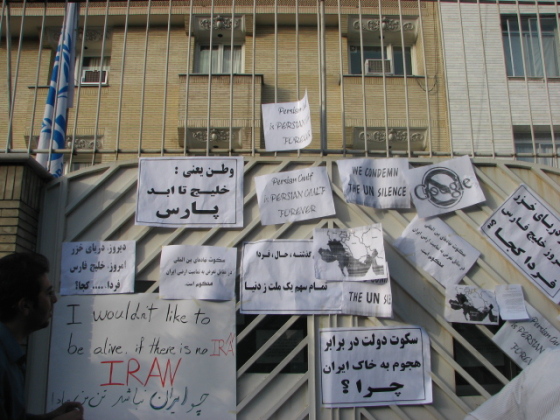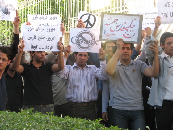جمعی اعضای انجمنهای اسلامی دانشجویان دانشگاههای شرق کشور وشهر مشهد با دعوت از فعالین مدنی، صنفی، دانشجویی و سیاسی مشهد عصر روز سه شنبه، سوم اردیبهشت 87 تجمعي اعتراضی مقابل دفتر سازمان ملل در مشهد برگزار نمودند. در ابتدای این برنامه عوامل نیروی انتظامی و امنيتي حاضر در محل با حضور گسترده در دو طرف خيابان سجاد مشهد ( محل برگزاري تجمع ) قصد داشتند تا مانع از برگزاری مراسم به بهانهی نداشتن مجوز گردند که با اصرار و مقاومت برگزار کنندگان مواجه شدند. تجمع کنندگان که تعدادشان به بيش از 200 نفر میرسید با سر دادن سرود ای ایران مراسم خود را آغاز نمودند. اين تجمع دانشجويي با دو هدف 1. اعتراض به سكوت و همگامي نهادهاي بين المللي با جريان سازمان يافته حمله به تماميت ارضي ايران و 2. اعتراض به سكوت و بي كفايتي مسئولان دولت جمهوري اسلامي در واگذاري خاك و نام وطن به بيگانگان برگزار شد. دانشجويان حاضر در اين تجمع سكوت دولت در قبال هجوم بي سابقه به ايران را با ايجاد سركوب و خفقان در داخل كشور مرتبط و رفتار دولت فعلي در عقب نشيني و باج دادن به بيگانگان و همزمان سركوب جامعه مدني و خصوصا دانشجويان در داخل كشور را مشابه رفتارهاي دولت هاي قجري دانستند وبه ان اعتراض داشتند. در ابتدای این برنامه محمد احسانی دبیر سابق انجمن اسلامی دانشگاه سیستان و بلوچستان با اشاره به اصل 27 قانون اساسی گفت: «قانون اساسی ایرانی به صراحت از تشکیل اجتماعات و راه پیماییها بدون حمل سلاح و به شرط آنکه مخل مبانی اسلام نباشد دفاع مینماید. بنابراین برپایی این تجمع با استناد به این اصل شفاف قانون اساسی صورت میگیرد و قانوني است.» این فعال دانشجويي در ادامه با اشاره به اقدام سایت گوگل در تغییر نام خلیج فارس به خلیج عرب گفت: «یکی از دلایل تشکیل این تجمع اقدام غیر حقوقي وسياسي سایت گوگل در تغيير نام خليج فارس و همچنین اداعاهای مکرر و بی اساس امارات متحدهي عربی بر مالکیت جزایر سهگانه ایرانی تنب بزرگ، تنب کوچک و ابوموسی میباشد.» در ادامهي این مراسم اشکان آرشیان عضو انجمن اسلامی دانشجویان دانشگاه فردوسی با اشاره به تاریخ و تمدن پرشکوه ایران، اعتراض خود را به اقدامات اخیر اعلام داشت. پس از ایشان علی صابری دبیر سابق انجمن اسلامی امیرکبیر با اشاره به ضعف دولت و دستگاه دیپلماسی ریشهی مجموعه اتفاقات اخیر را در نابهسامانی دستگاههای دولتی دانست و اظهار امیدواری کرد با جدیت و دقت بیشتر دیگر شاهد روند مذکور نباشیم. کوروش صالحی، دبیر گروه فرزندان اهورایی ایران دیگر فعال مدنی حاضر در این تجمع با ایراد سخنانی علمی دربارهی هویت و خود آگاهی و نقش آن در پیشرفت ملی گفت: «پژوهشهای تاریخی بر اساس اسناد معتبر نام شاخاب (خلیج) پارس را تا 2500 سال پیش به پس میبرد.» وی در ادامه خلیج فارس را یک نام تاریخی خواند و آنرا شناسهی ملیای دانست که با نام ایرانی پیوند خورده است و افزود: «نام خلیج فارس و نام ایرانی با فراز و فرودهای این سرزمین گاه به اوج رفته و گاه در سراشیب سقوط قرار گرفته است و اکنون در تندباد رویدادها بار دیگر تازیانههای دشمنان بر پیکرش فرود میآید تا سهل انگاری و بیغیرتی فرزندانش را با اندوه و اشک بنگرد.» حامد شهسورای عضو انجمن اسلامي دانشگاه پيام نور مشهد هم در این مراسم با ستودن هرگونه اعتراض و تجمع مدنی از قبیل تجمع برای خلیج فارس و یا جزایر سهگانه اهداف تمام این اعتراضات را پیگیری دموکراسی خواند. وی همچنین مجموعه اتفاقات اخیر دربارهی جزایر سهگانه را نشان از بیکفایتی مسئولین دولت جمهوری اسلامی دانست. در این مراسم همچنین حامد پناهآبادی دبیر سابق انجمن اسلامی دانشگاه پیام نور مشهد اعتراض خود را نسبت به اقدام سایت گوگل را اعلام داشت . گفت: «در دورهای که اعراب بر این سرزمین حکمرانی میکردند هم هرگز چنین تغییر نامی صورت نگرفت!» در این مراسم شرکت کنندگان نوشتههایی را با عناوینی چون: «وطن یعنی گذشته حال فردا، تمام سهم یک ملت ز دنیا»، «سکوت دولت در برابر هجوم بی